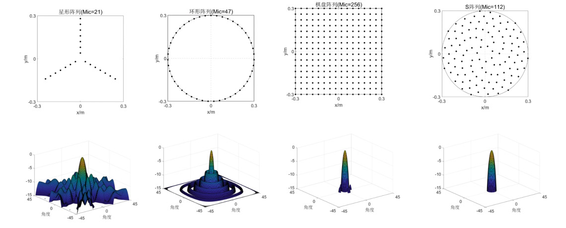 上图中不同排布形式的传声器阵列的响应图谱的计算结果,其中星形、环形、棋盘阵列采用均匀排布,螺旋形为非均匀排布,相邻最近的传声器间隔为0.04m,分析中阵列孔径均为0.6m,均匀阵列的传声器间隔均为0.04m。在相同的阵列孔径及传声器间隔下,星形、环形、棋盘阵列所需要的传声器个数依次增多,而螺旋形(S阵列)排布的传声器个数为112个,矩形阵列所需要的阵元个数远远超出其他结构的阵列。阵列响应图谱结果显示,星形阵列、环形阵列的旁瓣较多,矩形阵列、螺旋形阵列的旁瓣相对较少,说明了矩形阵列与螺旋形阵列拥有相对较好的抗干扰能力。螺旋形阵列在15dB的显示范围内没有虚假声源,更适应在复杂的声学环境中准确的识别出真实声源的位置。